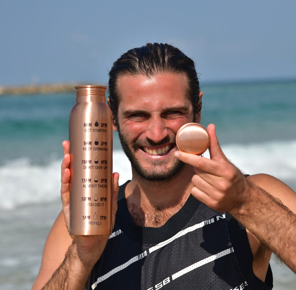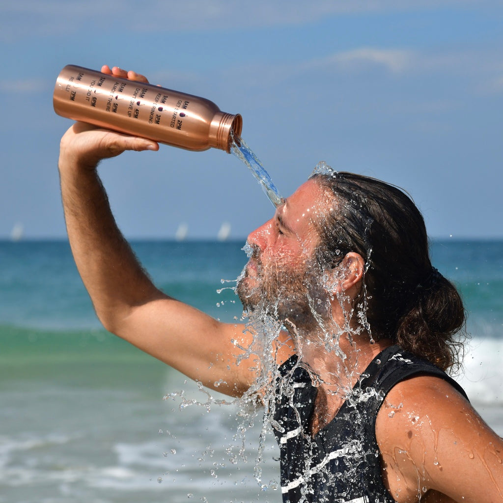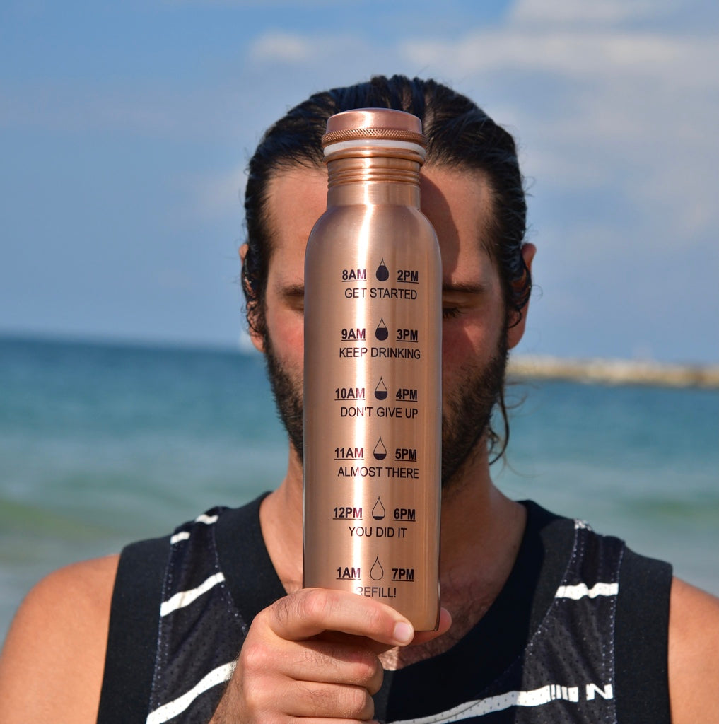 Pour permettre au processus oligodynamique (libération des ions de cuivre en petite quantité dans l’eau) de se faire, il faut remplir sa bouteille en cuivre avec de l’eau 6h à 8h avant de la boire. Le soir est donc le moment idéal pour cela, car vous pouvez laisser la bouteille en cuivre sur votre table de nuit et la boire directement au réveil. L’eau est ainsi bien ionisée et la boire le matin permet de mettre en route le système digestif et renforce le métabolisme. Vous pouvez également boire l’eau de votre bouteille en cuivre au cours de votre journée et la re-remplir au besoin.